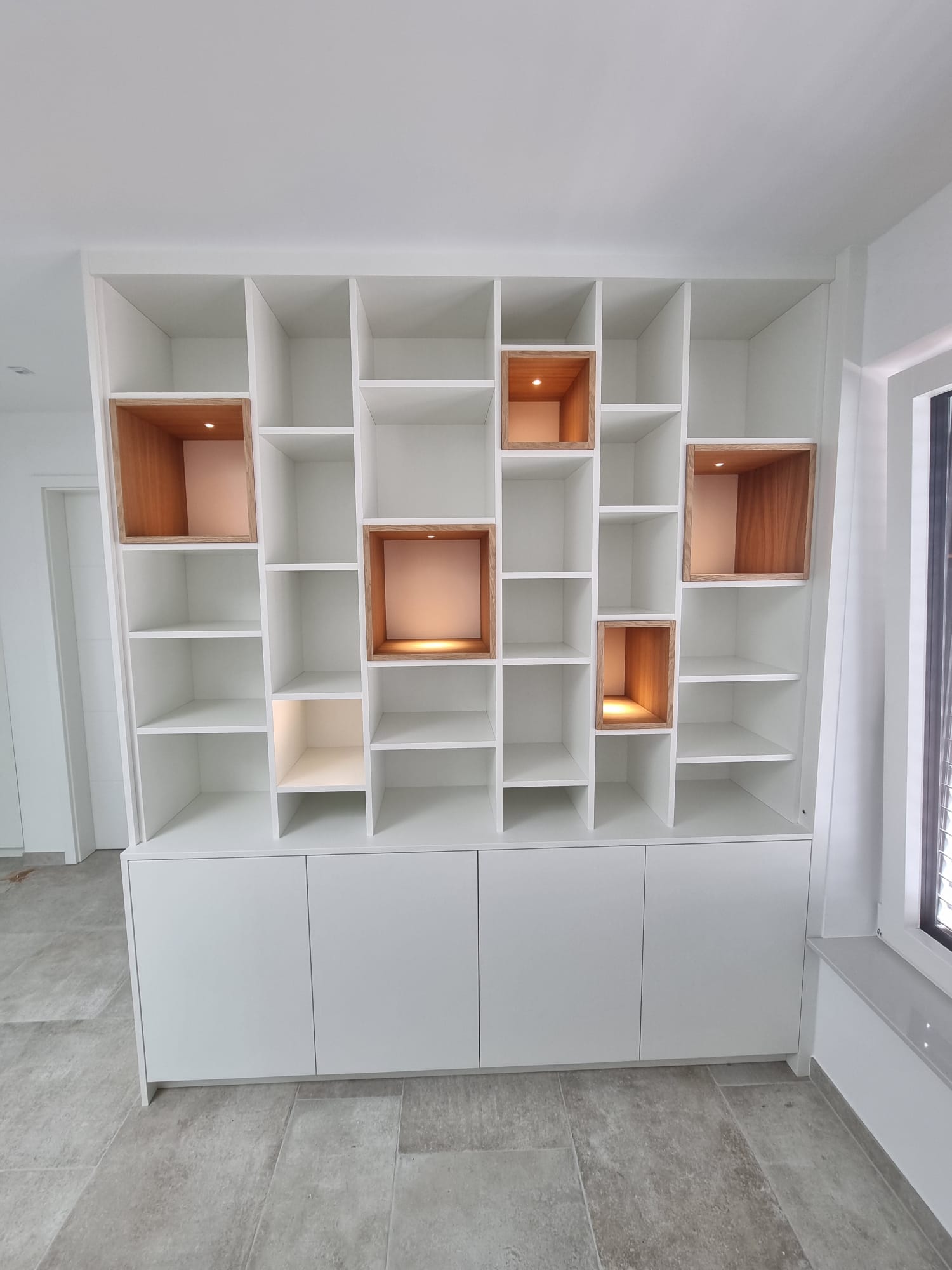 Niches et étagères rétroéclairées, variateur intégré, sans câble apparent.